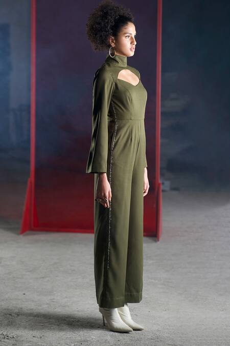 Green jumpsuit featuring a cut-out bodice with typographic detail on the side