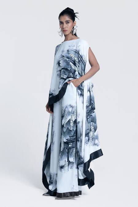 Black border detail along the hem, Sleeveless design with poncho sleeves