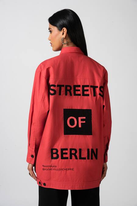 Red Cotton Embroidery Collared Signature Long Oversized Jacket