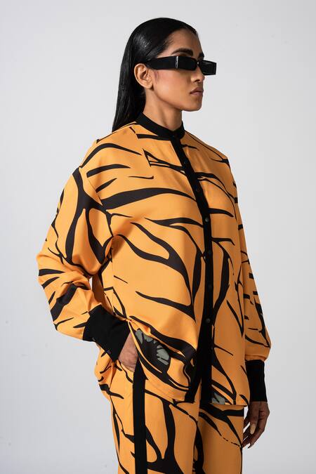 Yellow shirt featuring a mandarin collar and long cuffed sleeves with an abstract print. Paired with matching printed pants for a coordinated look.