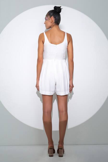 Buy_Pocketful Of Cherrie_White Crepe Scoop Neck Sleeveless Box Pleated Romper_at_Aza_Fashions