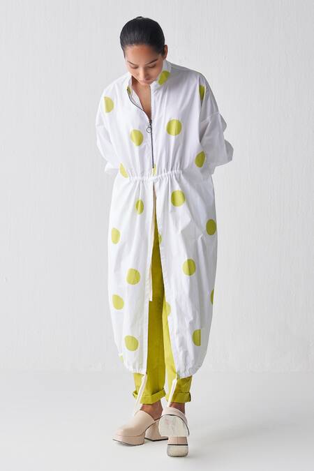 White tunic featuring lime green polka dot patterns and a front zip closure