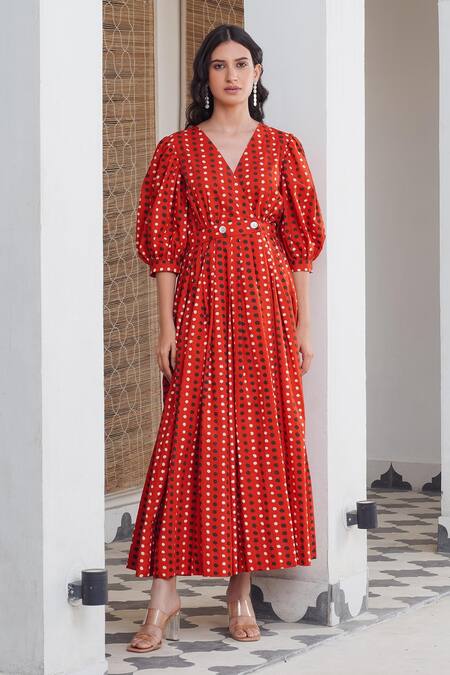 Red cotton polka dot print wrap maxi dress with balloon sleeves.