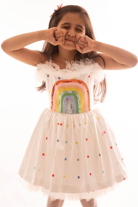 White dress featuring all-over polka dot print and an embroidered rainbow patch