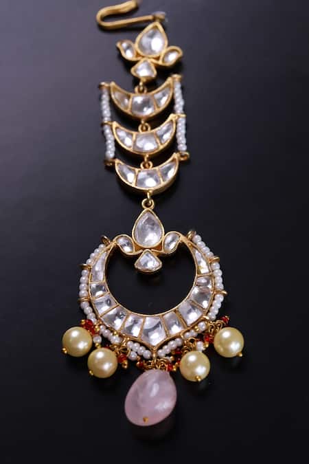 Gold maangtikka featuring polki embellishments, pearl highlights, and a rose quartz stone drop