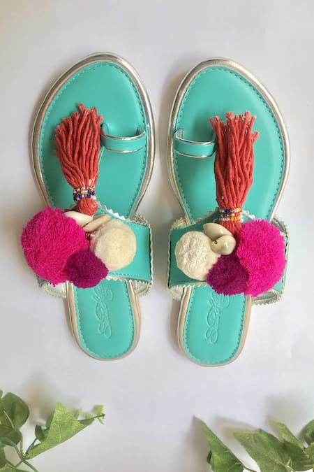 Turquoise blue sandals featuring multi-color pom pom, tassel & filigree cutwork detail