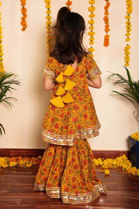 Yellow kurta featuring floral hand block print and gotta lace border. Paired with a coordinating sharara and gotta lace work dupatta.