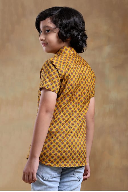 Buy_Pomcha Jaipur_Yellow Cotton Embroidery Floral Hand Block Printed Mustard Shirt _Online_at_Aza_Fashions