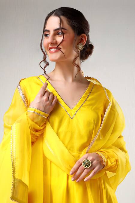 Yellow organza anarkali featuring gota lace embroidery and a back tie-up closure. Accompanied by a matching pant and dupatta.