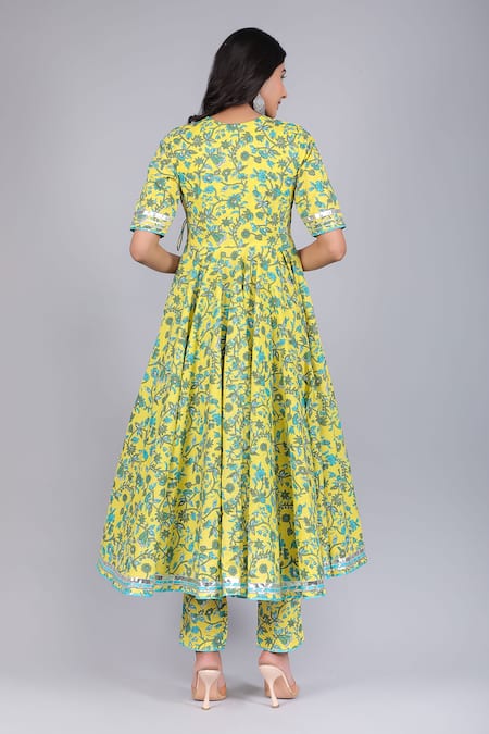 Yellow Cotton, Net V-neck Flora Print Angrakha Pant Set