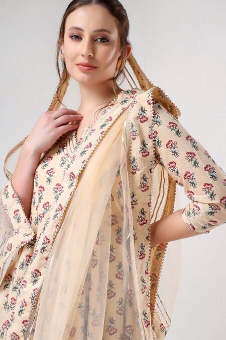 Beige floral print anarkali featuring three quarter sleeves and a round neckline. Paired with coordinating pant and soft net dupatta with printed border.
