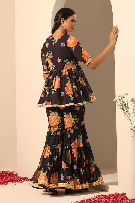 Buy_Pomcha Jaipur_Black Georgette Gota Patti V-neck Floral Pattern Peplum Tunic And Sharara Set