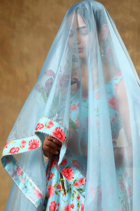Blue floral printed anarkali featuring gota lace embroidery and a back tie-up. Paired with matching pant and organza dupatta.