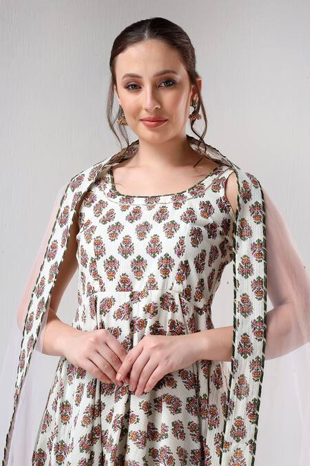 White cotton anarkali featuring floral print and gota lace embroidery. Paired with matching pants and a soft net dupatta.