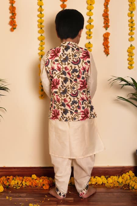 White floral print bundi featuring a mandarin neckline and full sleeves. Paired with a matching kurta and dhoti pant in cotton silk blend.