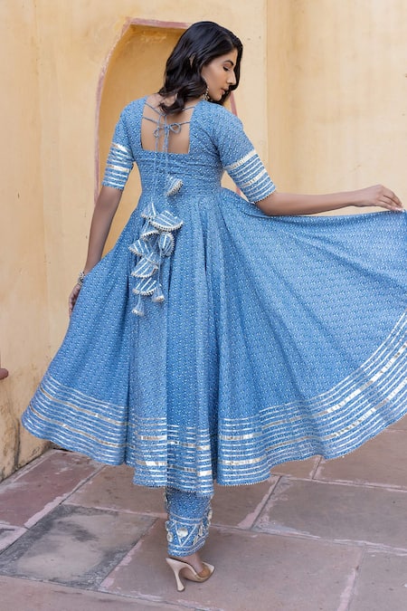 Blue Cotton Gota Patti Floral Print Anarkali Set
