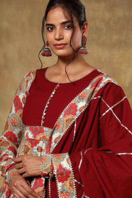 Maroon Cotton Embroidery Round Neck Floral Print Anarkali Set