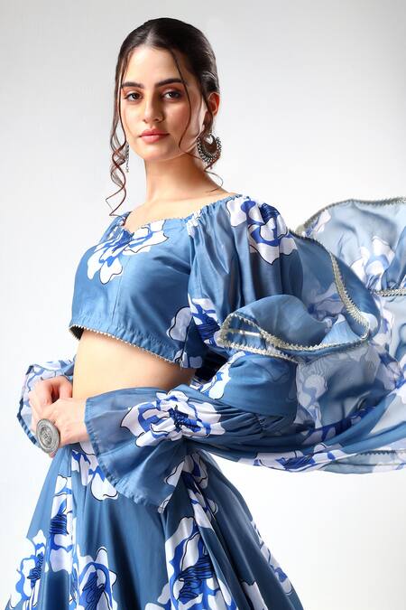 Blue Organza, Cotton Embroidery, Gota Patti Floral Print Ruffled Lehenga Set