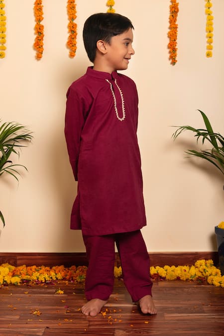 Burgundy kurta featuring gotta lace work and a Mandarin neckline. Paired with matching pants for a complete look.