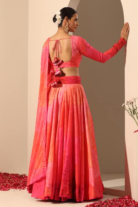 Back tassel tie-up detail on blouse, Floral pattern on lehenga, 10 metre ghera for enhanced flair