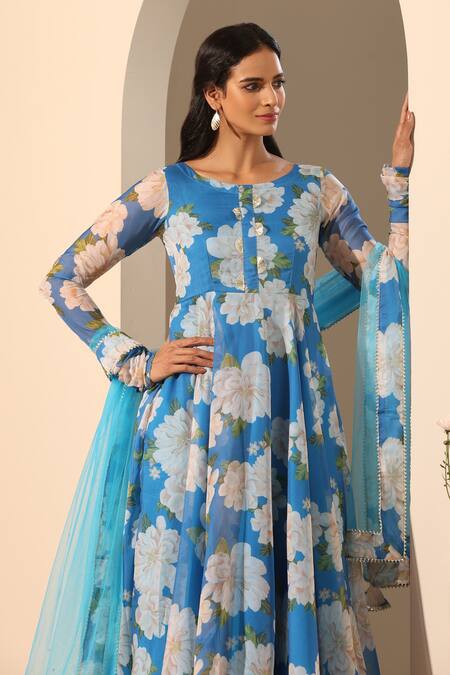 Blue anarkali featuring floral embroidery in organza fabric. Paired with a cotton pant and soft net dupatta.