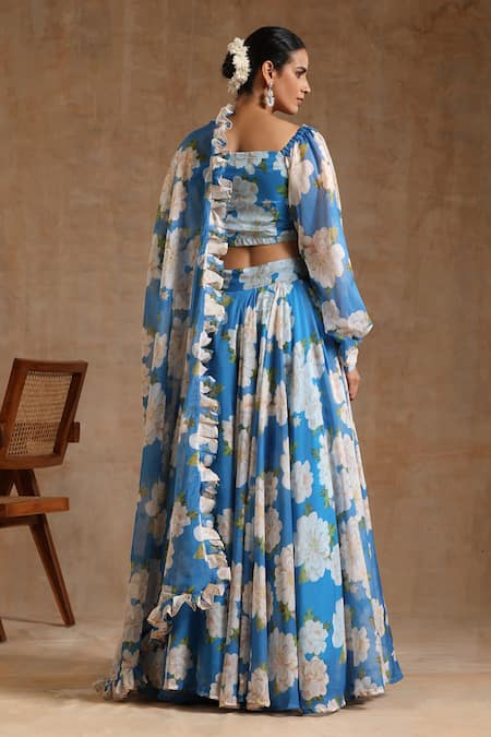 Blue floral lehenga in organza featuring a ruched blouse with balloon sleeves. Paired with a dupatta adorned with a frilled border.
