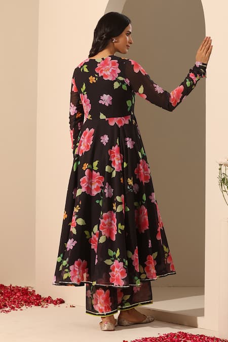 Buy_Pomcha Jaipur_Black Georgette Gota Patti V-neck Gul Gulaab Embroidered Anarkali Pant Set _at_Aza_Fashions