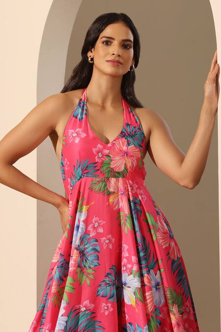 Pink halter neck maxi dress featuring all-over leaf and floral botanic patterns