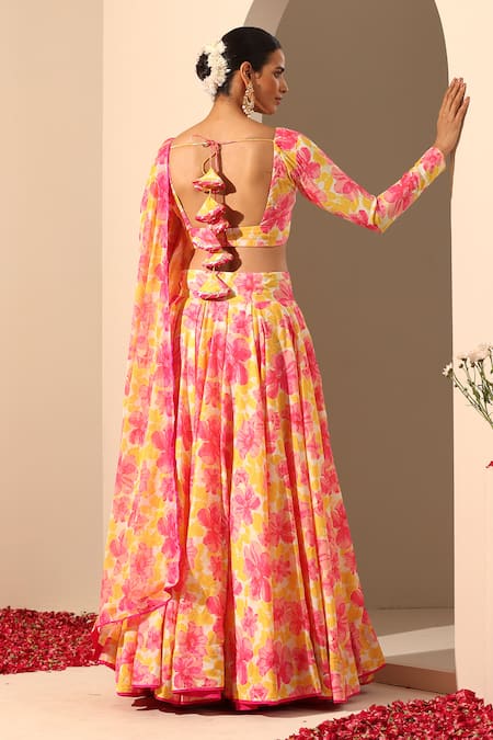 Buy_Pomcha Jaipur_Yellow Muslin, Chiffon Embroidery V-neck Gul Rangrez Floral Pattern Lehenga Set _Online_at_Aza_Fashions