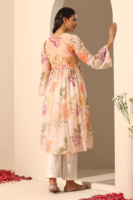 Pomcha Jaipur_Peach Georgette, Cotton, Silk Gul Ruhani Floral Pattern Kurta And Pant Set _Online_at_Aza_Fashions