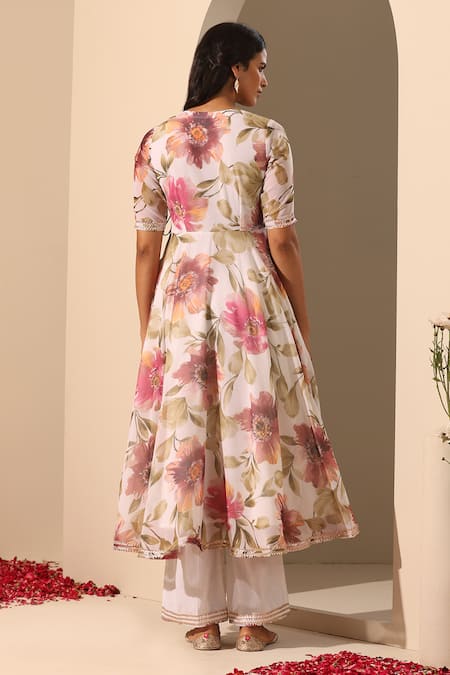 Buy_Pomcha Jaipur_White Georgette, Cotton Tassels, Gul Sufiyana Floral Pattern Angarkha Set _Online_at_Aza_Fashions