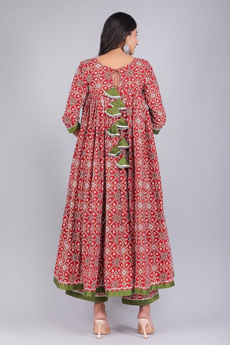 Buy_Pomcha Jaipur_Red Cotton, Net Tassels Round Neck Patola Print Anarkali Palazzo Set _at_Aza_Fashions