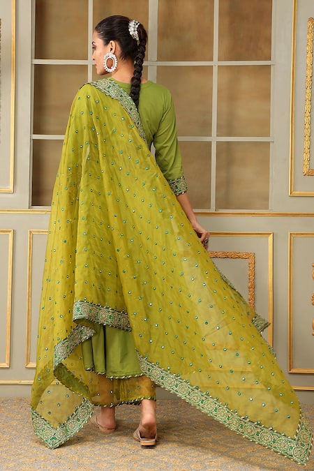 Green Cotton, Organza Gota Patti, Mirrors, Saadgi Work Angrakha Anarkali Set