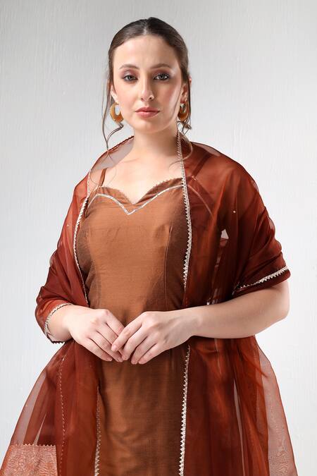 Brown Cotton, Silk, Organza Gota Patti Sweetheart Neck Straight Kurta Pant Set