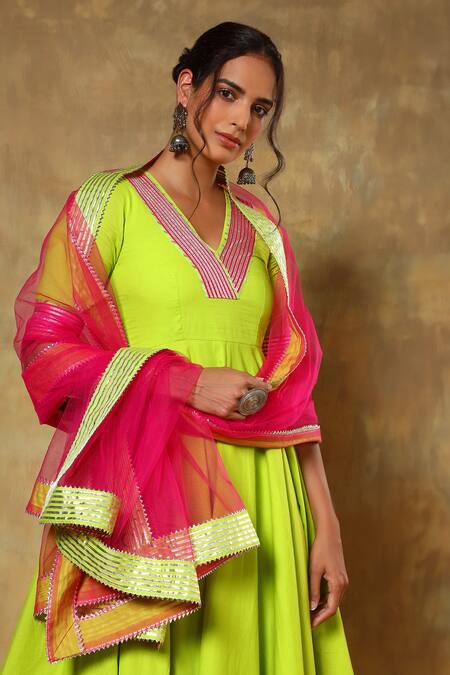 Buy_Pomcha Jaipur_Green Cotton, Net Gota Patti V-neck V Anarkali Pant Set _Online_at_Aza_Fashions
