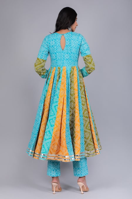 Blue anarkali featuring all-over bandhej print, gota patti trim on the sleeves and hem. Paired with straight fit pant and a soft net dupatta with printed border.