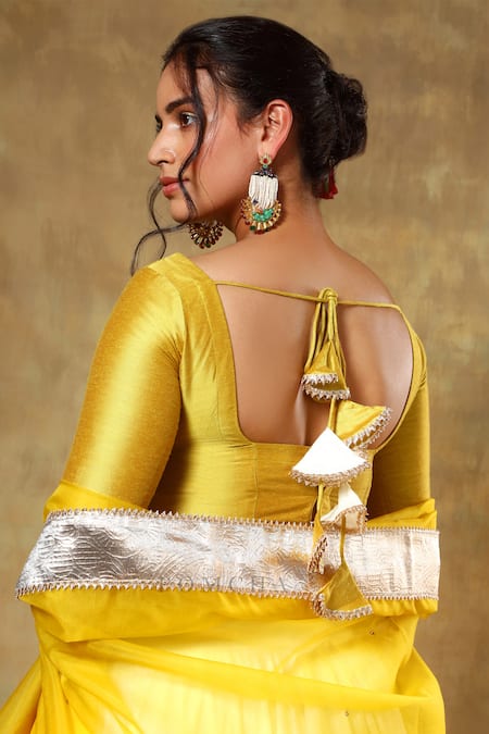 Yellow blouse featuring metallic lace trims with a tassel tie-up back neck. Paired with a white lehenga and a yellow sheer dupatta with lace detailing.
