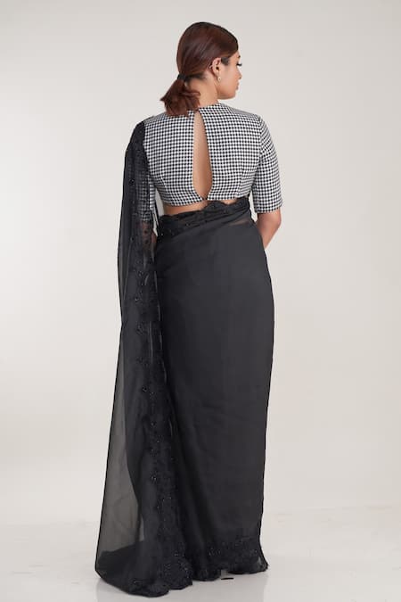 Black saree crafted from pure organza featuring chantilly and bead embellished borders. Paired with a silk tweed blouse showcasing a round neckline and half sleeves, complemented by a keyhole back detail.