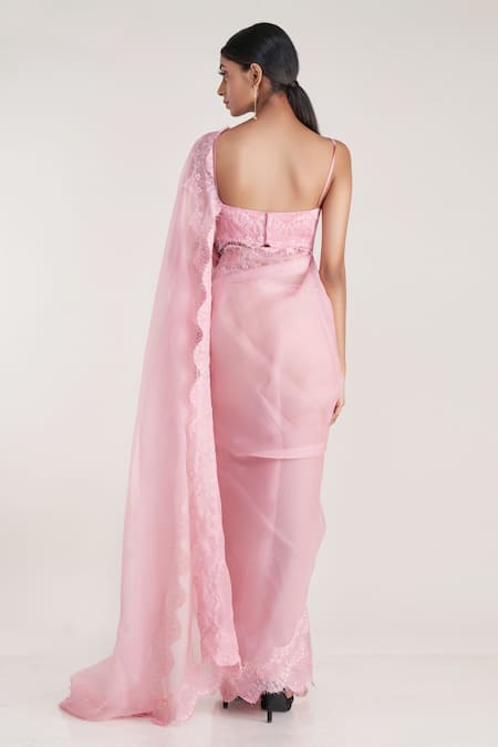 Pink saree crafted from pure silk organza featuring a tonal chantilly lace trim on the border. Paired with a sleeveless strappy blouse with a sweetheart neckline and back hook closure.