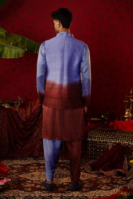 Blue and brown kurta featuring full sleeves and band collar with ombre pattern. Paired with a draped dhoti pant that complements the kurta's design.