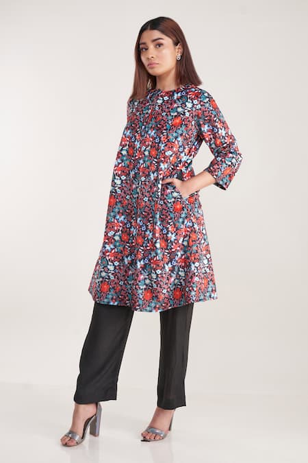 Black floral printed kurta featuring a round neckline and long sleeves. Paired with matching black pants, this set is made from vegan silk suede and pure natural crepe.