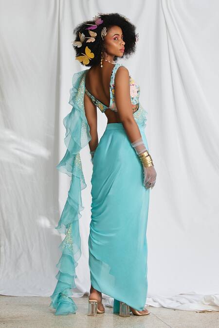 Blue sleeveless padded blouse featuring multi-thread florence embroidery and sequin highlights with an attached organza silk ruffled drape. Paired with a cascading flowy draped skirt in natural crepe.