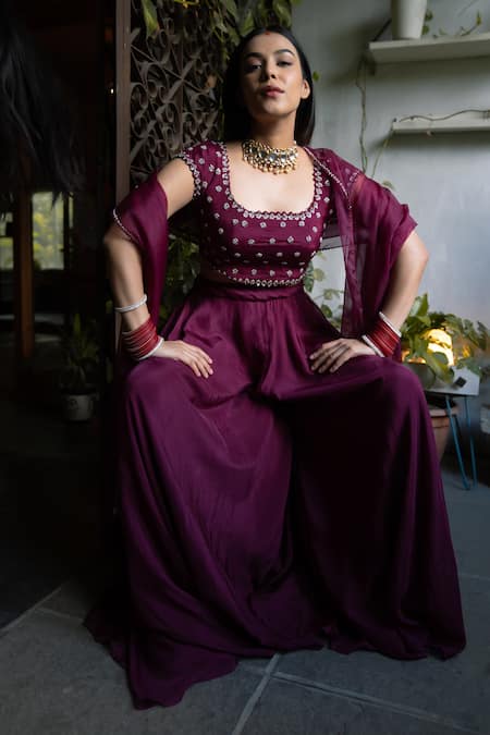 Purple embellished blouse with bead and pearl detailing. Paired with a pleated sharara and a matching dupatta.