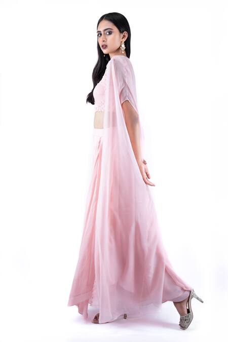 Pink embellished blouse featuring a sweetheart neckline and back hook closure. Paired with a matching rosebud cape and gathered box pleated draped pant.