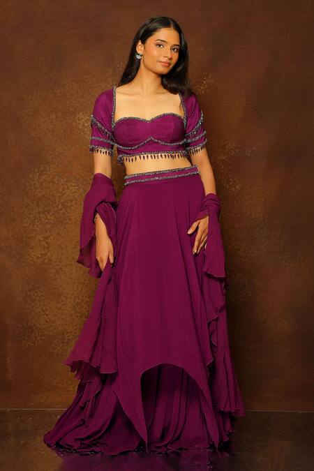 Purple Silk, Georgette Cut Work, Sequins, Beads, Layered Shackle Lehenga Set