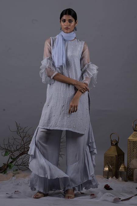 Cloud blue kurta featuring pleated ruffle sleeves with all-over pearl meadow embroidery. Paired with flared ruffled pant and a tulle stole.