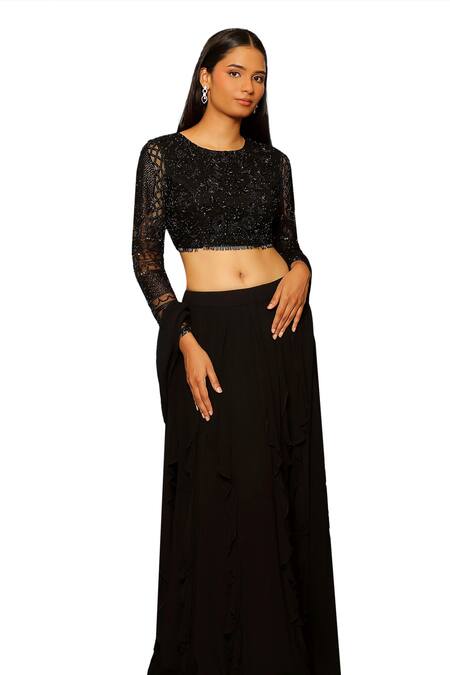 Black Tulle, Georgette Pearls, Tassels, Beads Round Ruffle Lehenga Blouse Set