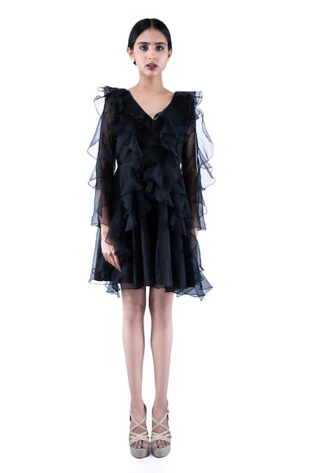 Black dress featuring a V neck and ruffle detailing on sleeves
