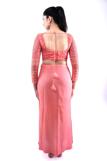 Peach Chiffon, Tulle Embroidery Round Neck Scallop Border Saree Set