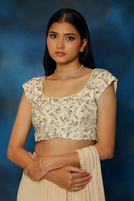 Beige pre-draped ruffled saree featuring layers and side drape with bead embellishments. Paired with a padded blouse that has floral embroidery adorned with sequins and beads.